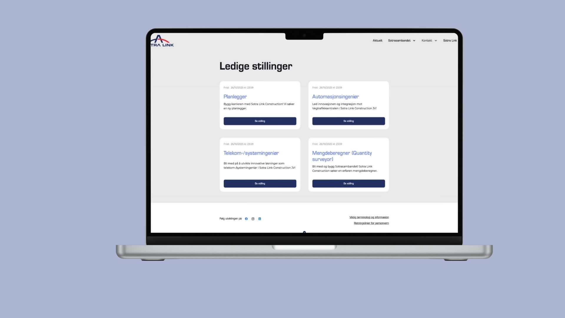 Arbeidsflyt: Brukere kan browse gjennom tilgjengelige stillinger og sende inn søknader direkte via nettsiden. Søknadene blir automatisk levert til Sotra Link, som deretter håndterer den videre prosessen med screening, intervjuer og oppfølging av kandidater.