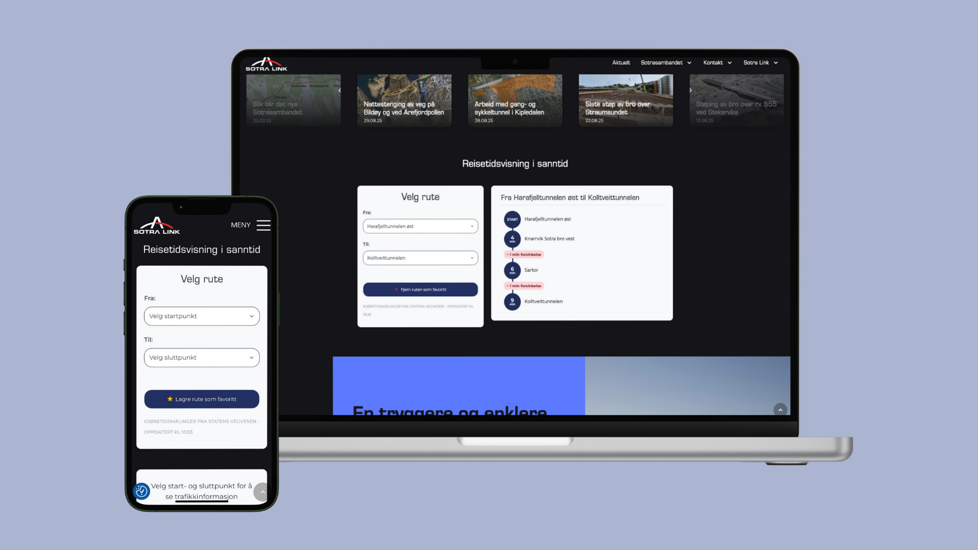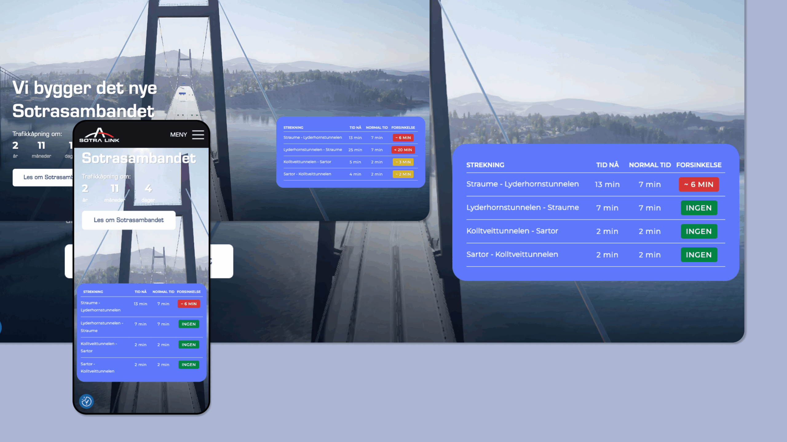 Teknisk implementering: Modulen integrerer sømløst med DATEX-datastrømmen og presenterer informasjonen på en brukervennligmåte. Den håndterer komplekse trafikkalgoritmer og presenterer resultatene i en lett forståelig format. Nettsiden og de tilhørende modulene representerer et omfattende digitalt økosystem som støtter både operasjonelle og kommunikasjonsmessige behov for Norges største veiinfrastrukturprosjekt. Løsningen kombinerer avansert teknisk utvikling med praktisk nytteverdi for både prosjektets interessenter og den generelle befolkningen i området rundt. Modulene demonstrerer evnen til å integrere komplekse, offentlige datasystemer med moderne webteknologi og skape verdifulle tjenester som forbedrer både prosjektets synlighet og operasjonelle effektivitet. Sotra Link-nettsiden og de tilhørende modulene representerer en helhetlig tilnærming til digital kommunikasjon og tjenesteyting for store infrastrukturprosjekter. Prosjektet viser teknisk ekspertise innen dataintegrasjon, brukeropplevelse og modulær systemarkitektur, og leverer konkrete verdiløsninger for både prosjektets gjennomføring og offentlig informasjonstilgang.