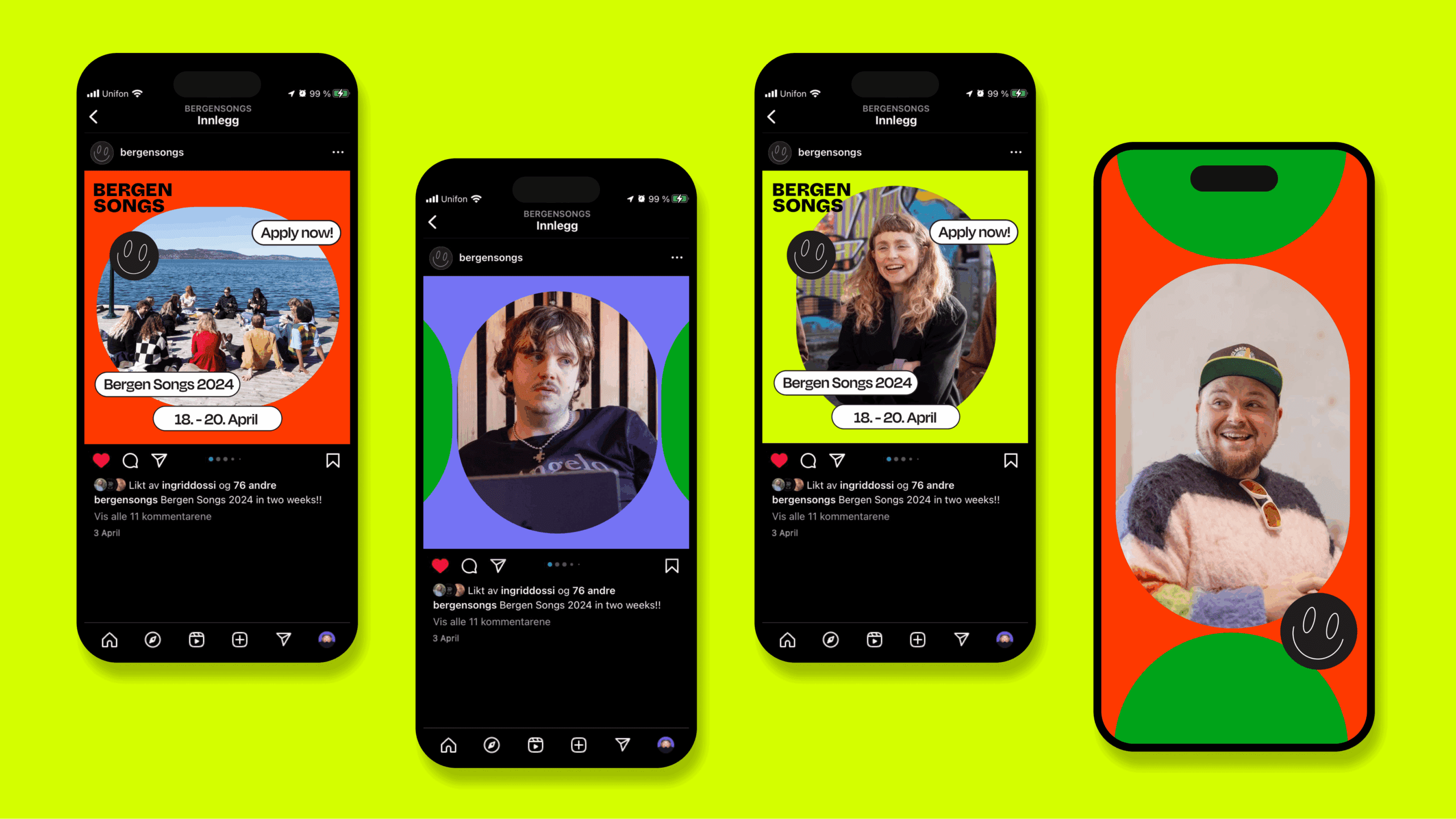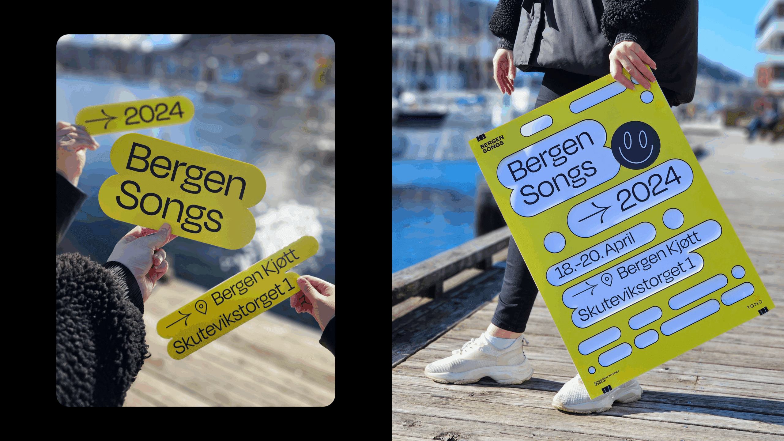 Siden bærekraft er et viktig prinsipp for Bergen Songs, er det også integrert i den visuelle identiteten. Både ved å optimalisere de digitale ressursene, og ved å ha en gjenbrukbar løsning for plakater og skilt.