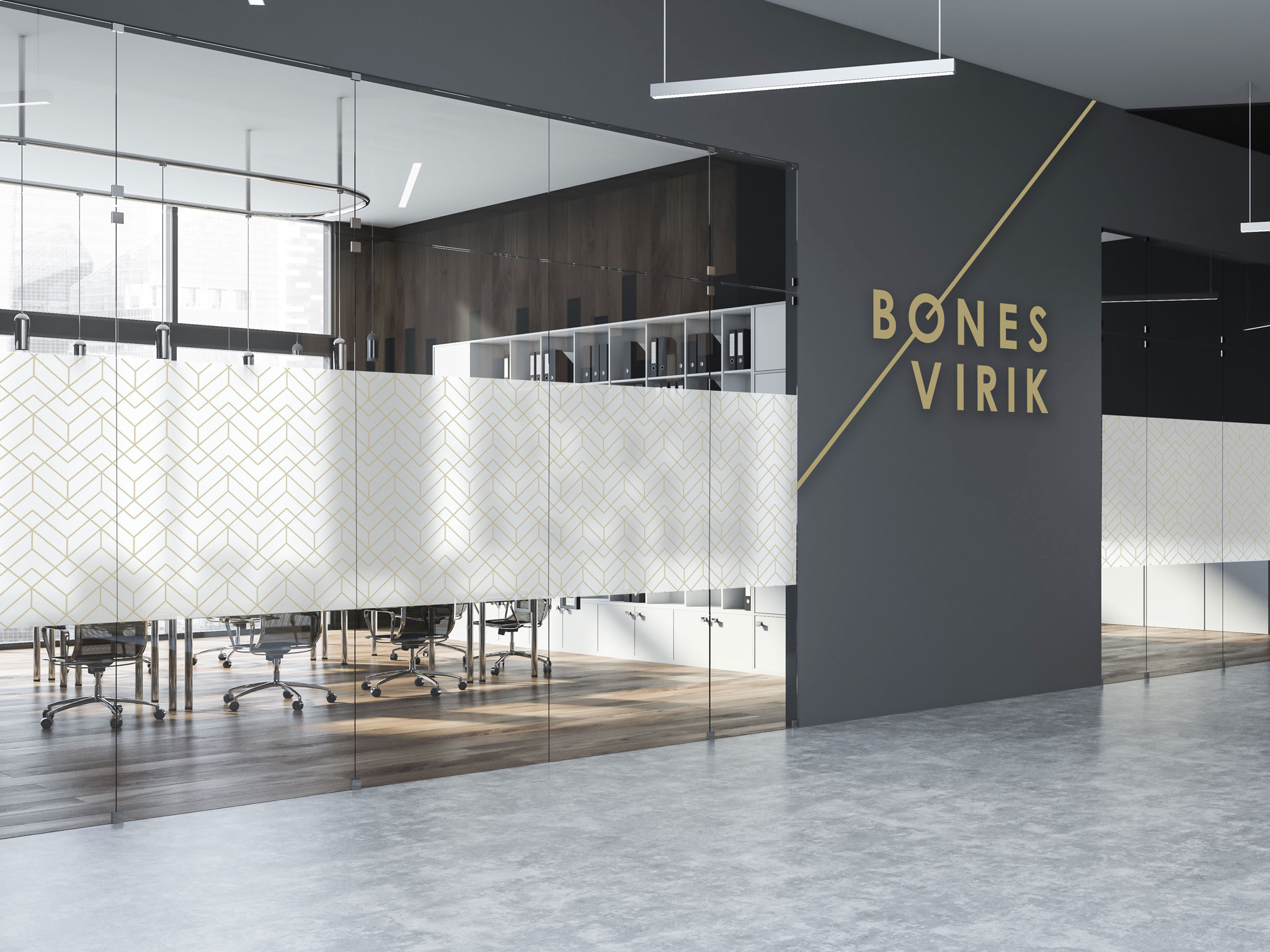 Mockup som viser Bønes Viriks visuelle identitet og logo som kontorinndredning