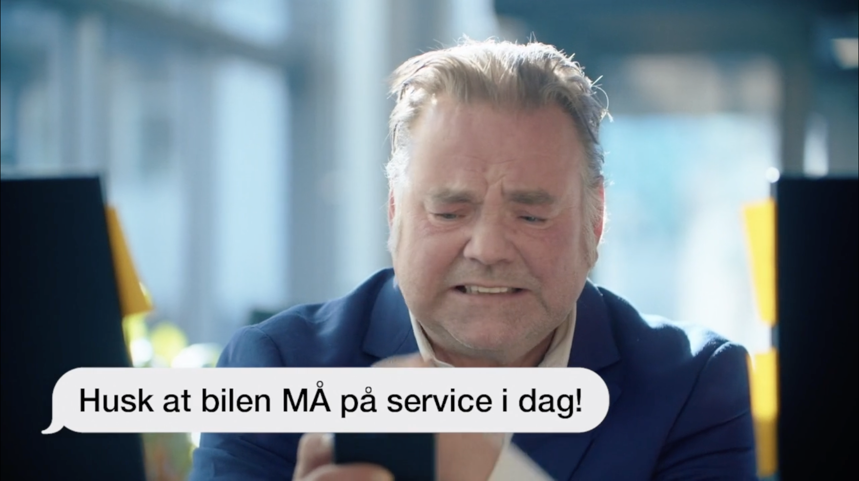 Skjermdump fra reklamefilm for Carfix og service på dagen, bidlet viser skuespiller Kai Taule